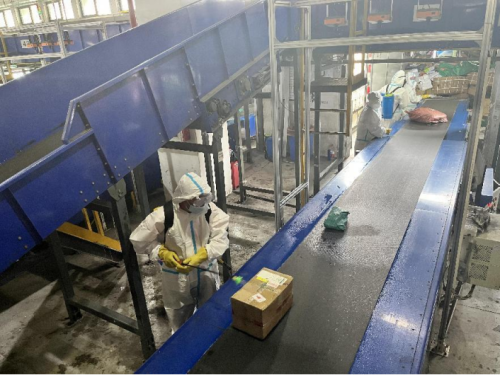 郵件到達營投部后,郵政人員對車輛和郵件還要進行全面消殺?!肮ぷ魅藛T上崗前發送健康碼和行程碼,到崗后第一件事先測量體溫做好登記,佩戴手套、口罩等,然后對車輛全部消殺一遍,對郵件外包裝至少每2小時進行一次消殺……”中國郵政集團有限公司南京市鼓樓區寄遞事業部副總經理馬曉東說道,營投部每日進行多頻次消殺和通風,從操作間地面、快遞傳送帶到每一個快遞包裹,都會噴灑消毒,確保全覆蓋、無死角,保證生產生活環境清潔安全。