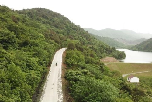 在安徽省巢湖市散兵鎮山區里,鄭愛軍騎行在投遞郵件的路上(4月30日無人機拍攝)。