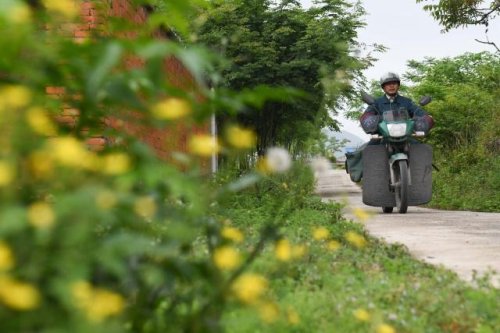 在安徽省巢湖市散兵鎮山口村,鄭愛軍騎行在投遞郵件的路上(4月30日攝)。