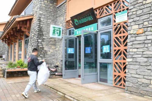 “馬老板,快來查收包裹咯!”的日拉鐵將郵車停在沐恩邸社區藥店前大聲呼喊,并手腳麻利地將郵件從郵車上搬進藥店。