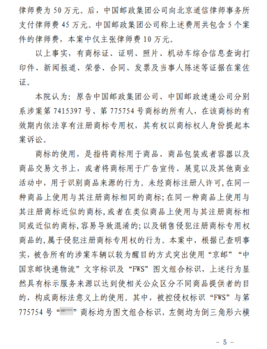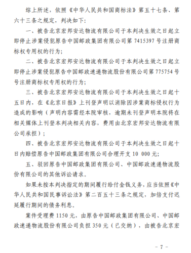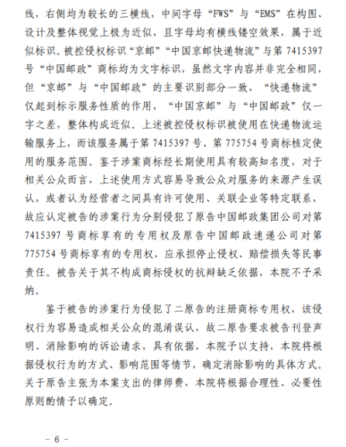 ”“中國郵政”商標(biāo)構(gòu)成近似,且涉案商標(biāo)使用在物流運(yùn)輸服務(wù)上,對于公眾而言容易導(dǎo)致對服務(wù)來源的誤認(rèn)或認(rèn)為經(jīng)營者之間具有許可使用、關(guān)聯(lián)企業(yè)等特定關(guān)系,遂判令被告立即停止侵權(quán)行為、在《北京日報》上公開賠禮道歉并賠償中國郵政1萬元合理開支。