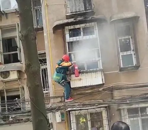 送報時偶遇起火,郵政投遞員接過社區人員的滅火器爬窗撲滅