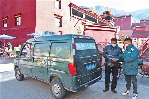 郵政工作人員將郵件送到德格印經(jīng)院。