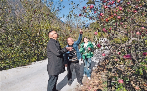 姑咱鎮(zhèn)郵政支局局長王光輝(左)與達杠村黨支部書記李強(中)一起實地了解蘋果生長情況。