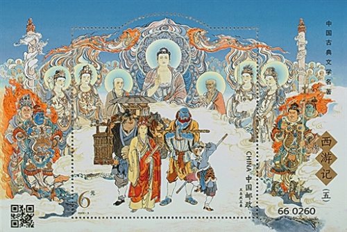 該套郵票是中國(guó)郵政自2015年發(fā)行的《中國(guó)古典文學(xué)名著——〈西游記〉》系列郵票的第五組,描繪了小說第七十四回至第一百回的五段故事場(chǎng)景。4枚郵票分別表現(xiàn)的是,孫悟空在獅駝嶺大戰(zhàn)青毛獅子、黃牙老象、大鵬雕三怪時(shí)激烈的打斗場(chǎng)景;孫悟空、豬八戒為救助被當(dāng)作藥引的比丘國(guó)眾孩童,在南極仙翁幫助下收服白鹿精、擒殺白面狐貍的場(chǎng)景;哪吒隨孫悟空去陷空山無底洞,擒獲欲強(qiáng)迫唐僧成親的金鼻白毛老鼠精的場(chǎng)景;孫悟空領(lǐng)著月宮主人太陰星君來到天竺國(guó),收服假冒公主的廣寒宮搗藥玉兔的場(chǎng)景。小型張表現(xiàn)了師徒四人和白龍馬取回真經(jīng)后,真身返回靈山,終成正果的場(chǎng)景。畫家運(yùn)用傳統(tǒng)工筆重彩的手法,同時(shí)注重以形寫神,人物刻畫逼真?zhèn)魃瘢诜酱玳g生動(dòng)地演繹出大家熟知的故事情節(jié)。