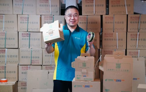 刁海濤帶著記者來到中國郵政集團有限公司北京市分公司一處擺滿貨架和快遞箱的生產現場。“1、2、3、4、5……”不到一分鐘的工夫,一個無需膠帶、僅靠拼插即可成型的快遞紙箱就在刁海濤手中組裝完畢?!斑?!”他向剛剛拼插好的快遞紙箱重重擊打了一拳,紙箱表面只有輕微的凹陷,并沒有發生任何損壞。刁海濤解釋說,這款專利包裝箱借鑒了中國傳統的榫卯技術,單純依靠折疊、插接就能快速組裝完成,完全不需要使用膠帶進行封裝。別看比普通紙箱的重量輕,但這款專利產品的邊壓強度、耐戳穿力、抗跌落能力等指標,都遠比普通紙箱要強得多。