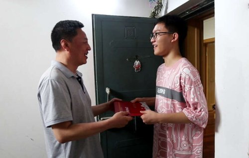 王曉宏將國科大本科生錄取通知書郵件送到王鶴鳴手中。受訪者供圖