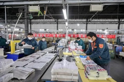 在位于滬太路的報(bào)刊處理場地,郵政工作人員將試點(diǎn)地鐵運(yùn)快遞業(yè)務(wù)的報(bào)刊雜志用統(tǒng)一郵袋封裝后,運(yùn)輸至延長路地鐵站 許雨舟 攝(下同)
