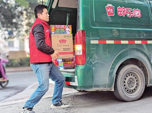 浙江省紹興市郵政分公司專職地推人員孫明在配送“年貨節”產品。 □鄭思薇 攝