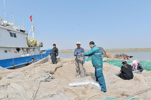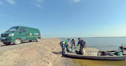 王海進(jìn)在漁船碼頭送特快專遞。