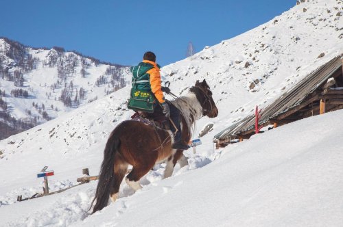 暴雪后的禾木鄉行路艱難。為將郵件及時送到半山腰處的養蜂戶家中,鄉郵員在進入山區后騎馬投送郵件。□安昆 攝