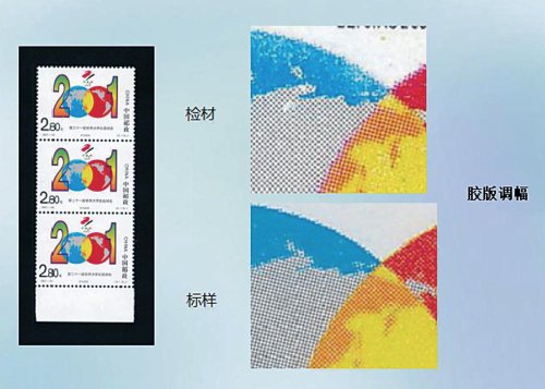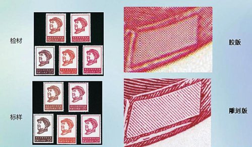 印刷版別是郵票真偽鑒別最本質最重要的鑒別特征,所以要識別假郵票就需要掌握不同版別的印刷特點。而且,郵票印刷廠的印制設備也是仿印假票的小作坊所無法比擬的,仿印的假票無法達到與真郵票在印刷制版上完全相同,通過印刷版別的比對可以辨別檢材的真偽。