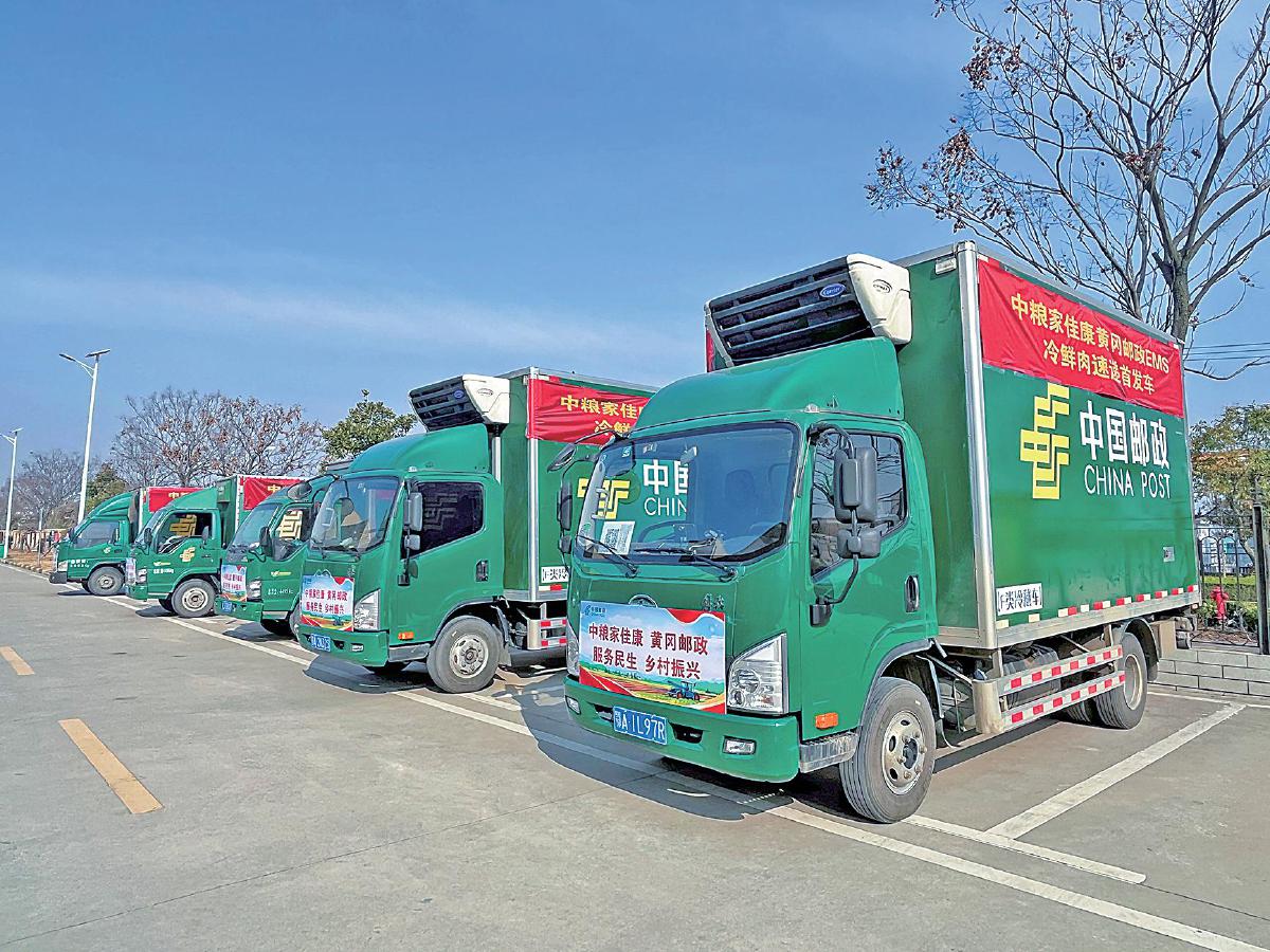 在黃岡市黃州區的中糧家佳康(湖北)有限公司園區,帶有郵政標識的冷藏車依次排開。
