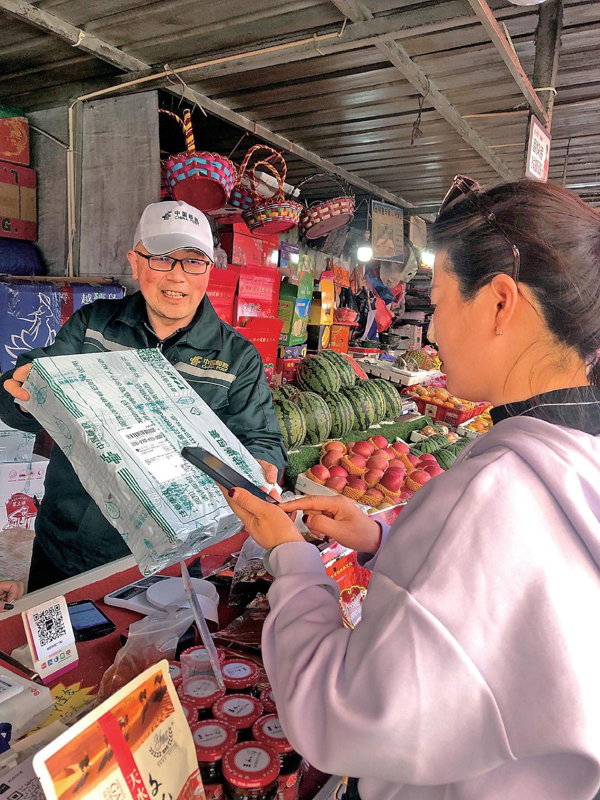 來自陜西的游客在天水市大眾路光明巷郵政收寄點寄遞甘谷辣椒面。