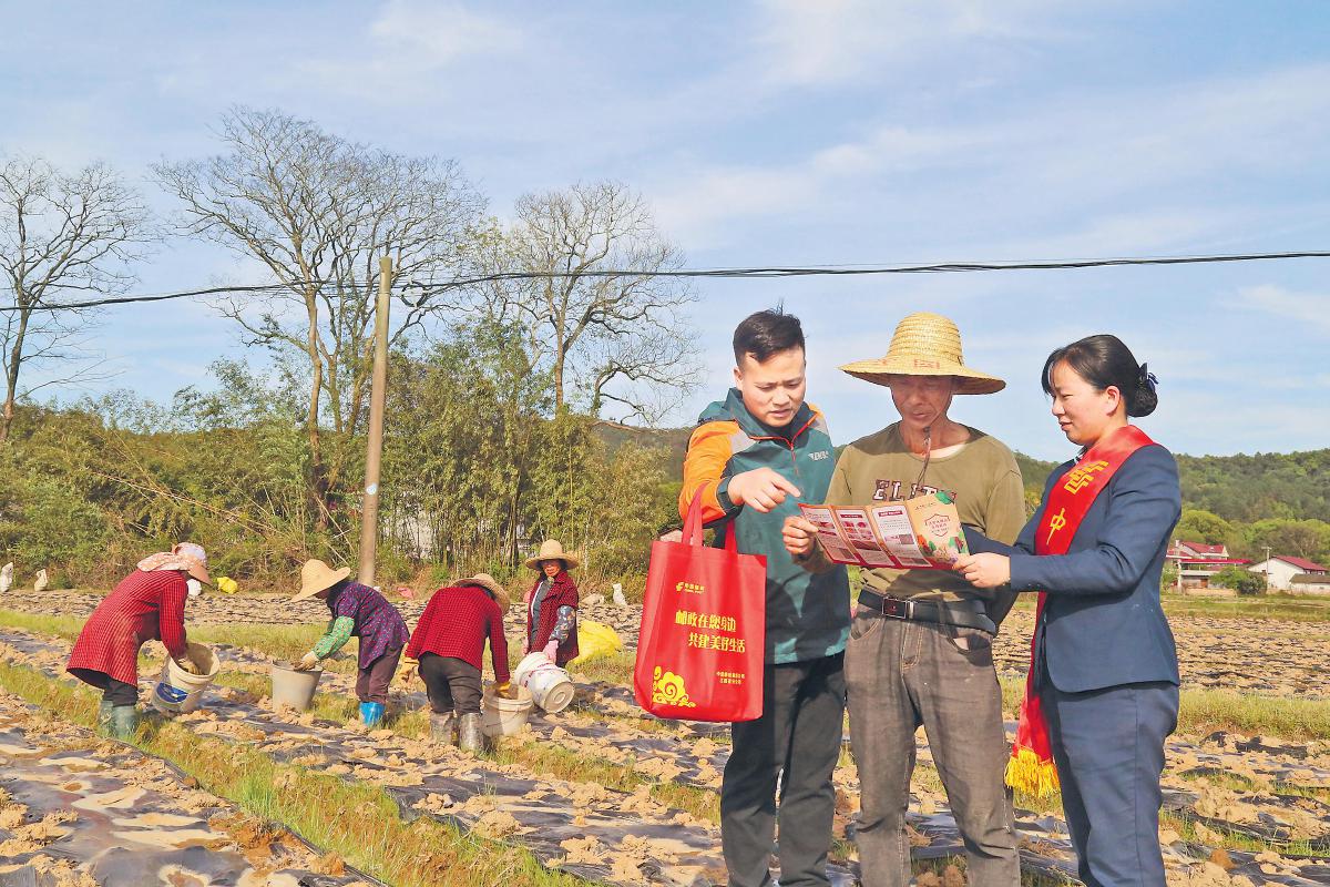 萬安縣枧頭郵政所員工春耕時節走進田間地頭,向村民普及金融知識。 □郭仙花 攝