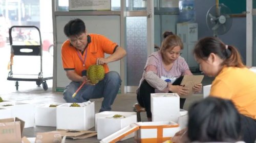 采訪完徐鈺鋒,記者跟隨潘新杰來到離郵政倉不遠的水果市場,為當日線上訂單客戶挑選榴蓮?!傲裆徱ㄟ^敲打來分辨生熟程度。偏生,就適合發較遠的地區;偏熟,則適合發往近的地方,這樣可以保證客戶收到水果時生熟正好。如果天氣熱,還要加冰來保證果肉新鮮。芒果如果是發到東北,我們會加裝保溫袋來避免水果凍傷?!闭f起不同水果的“發運經”,潘新杰滔滔不絕。