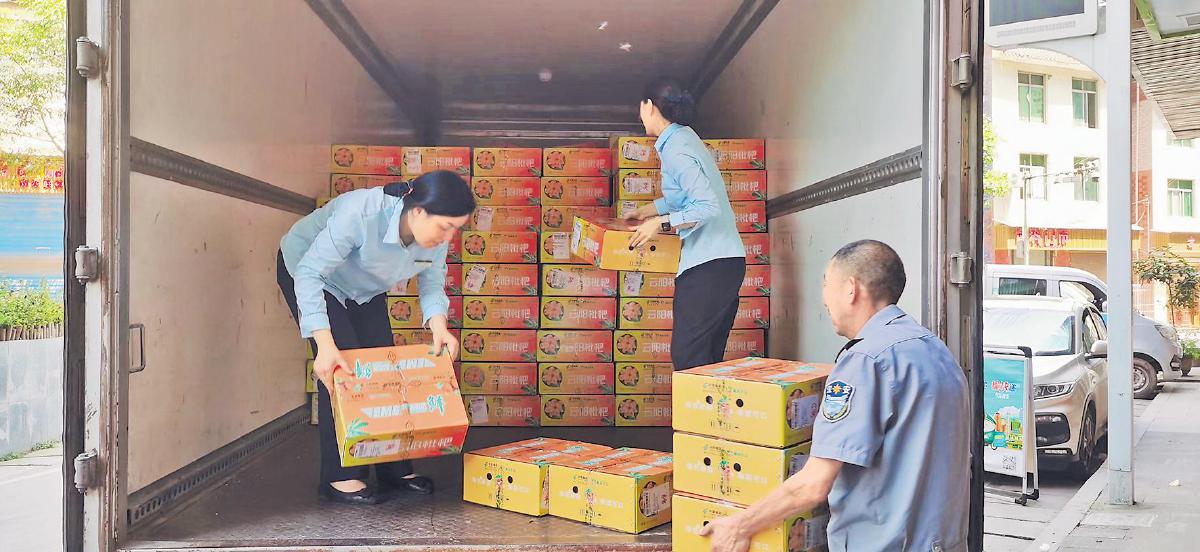 收寄高峰期,巴陽郵政所全員出動,把裝好箱的枇杷郵件搬上郵車?!踝T鵬程 攝