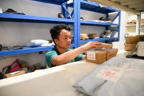 快遞抵達后,超市老板商興菊按照手機尾號把快遞分揀在貨架上。這家超市每天營業時間從早上六點至晚上十一點,村民在外干完農活可以隨時到超市免費取快遞。