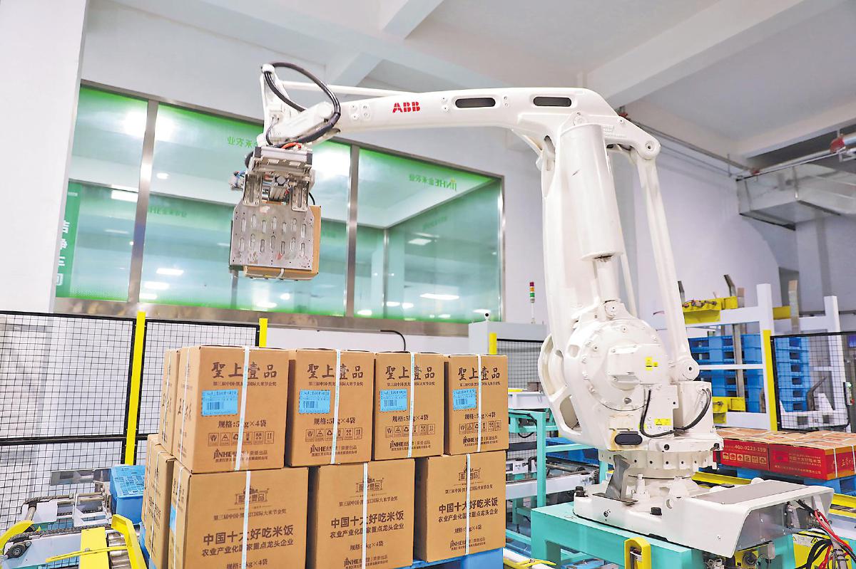 聽說郵儲銀行的人前來調研,本來臨時要出差的五常市金禾米業有限責任公司董事長李云輝將出行時間硬是推遲1小時,只為能見上一面。當看到金禾米業生產線上兩臺“ABB”數控機器臂正在精準分揀包裝好的盒裝高端稻米產品時,記者不禁感嘆:“普通的大米居然能做得如此高科技!”