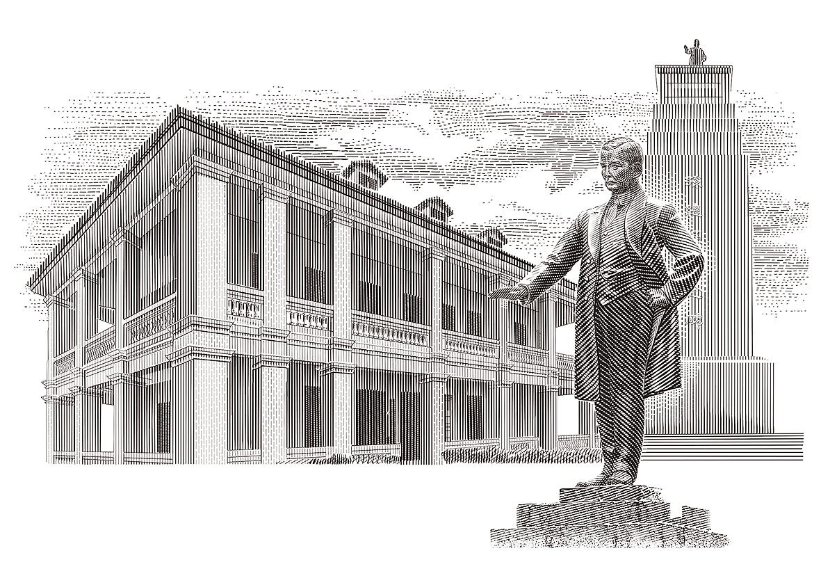 郵票二圖由徐喆和劉明慧兩位雕刻師共同創(chuàng)作。徐喆負(fù)責(zé)建筑部分,劉明慧負(fù)責(zé)雕像部分,于是同一枚郵票呈現(xiàn)出了兩種雕刻風(fēng)格,建筑的粗獷和人物的細(xì)膩,二者和諧統(tǒng)一、相得益彰。劉明慧對人物的刻畫非常準(zhǔn)確,能夠表現(xiàn)出原作的各種細(xì)微之處,特別是對人物面部表情的精準(zhǔn)把握,呈現(xiàn)出雕像特有的質(zhì)感和光影效果。選用紅色雕刻油墨印制,表達愛國精神,橘色的熒光使畫面更加溫暖、莊重。淡淡的米黃底色為郵票營造出一種復(fù)古的氛圍,既體現(xiàn)了年代感又與主題相得益彰,展現(xiàn)出黃埔軍校百年歷史的滄桑與厚重。