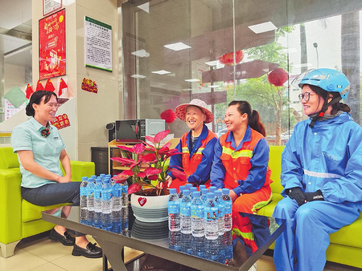 進入暑期以來,云南省德宏傣族景頗族自治州迎來高溫和降雨天氣,許多戶外勞動者頂著烈日、迎著風雨堅守在工作崗位上。德宏州郵政分公司積極履行社會責任,充分發揮“郵愛驛站”的作用,邀請清潔工、外賣員、快遞員等戶外勞動者到驛站納涼、休息,為戶外勞動者送上關愛。同時,驛站工作人員還主動開展金融知識宣傳,為戶外勞動者普及金融知識和防詐知識,受到戶外勞動者的歡迎。