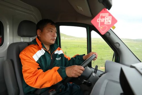 在位于額爾古納市西南方位的黑山頭鎮,采訪組跟著黑山頭郵政支局投遞員蘇濤將郵件裝車后,一路深入草原深處。