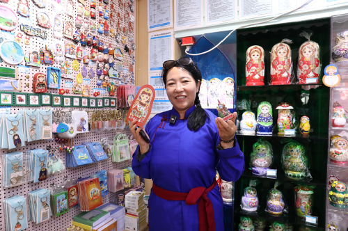 7月25日一大早,采訪組一行到達(dá)位于中俄邊境的滿洲里第五代國門。在位于國門景區(qū)的入口處,占地200多平方米的滿洲里國門主題郵局格外吸睛。進(jìn)入主題郵局,映入眼簾的是各類多巴胺色的文創(chuàng)產(chǎn)品,其中一款“綠皮火車穿越國門”圖案的冰箱貼凸顯地標(biāo)特色,尤其受到游客歡迎。該主題郵局負(fù)責(zé)人項(xiàng)欣說:“我們主題郵局里有郵品、文創(chuàng)產(chǎn)品、特色食品等500多種產(chǎn)品,以國門為主題的文創(chuàng)產(chǎn)品和鄂溫克族手工藝品非常受游客喜愛。”