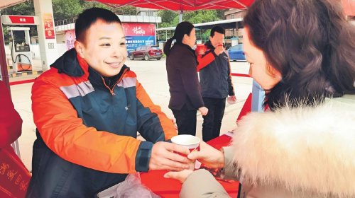 梧州市分公司開展營銷活動,朱哲給客戶遞上熱水。