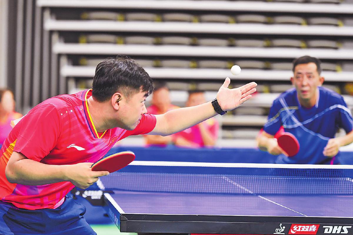 比賽中,男雙組合選手嚴(yán)陣以待。