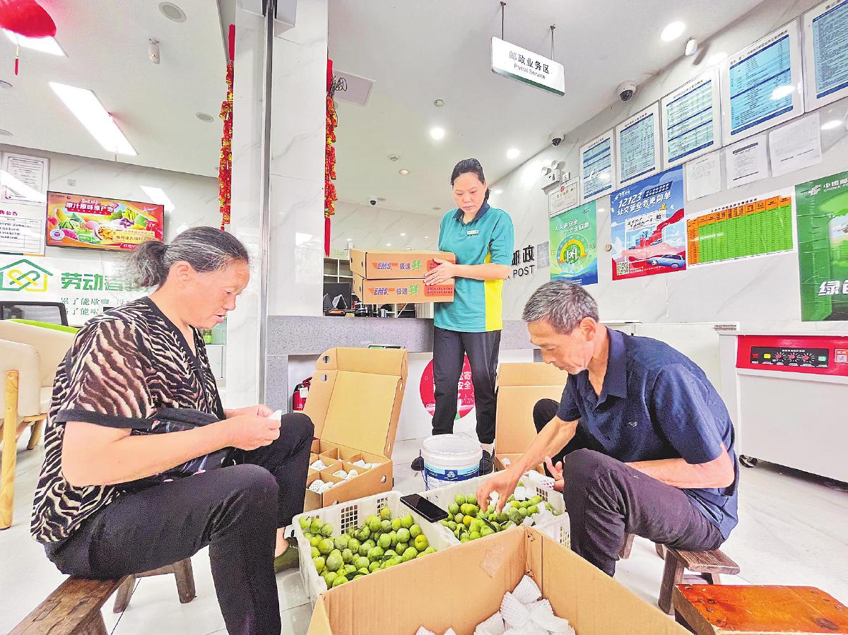 郵政網點為脆李寄遞散戶提供免費包裝服務。□肖婉君 攝