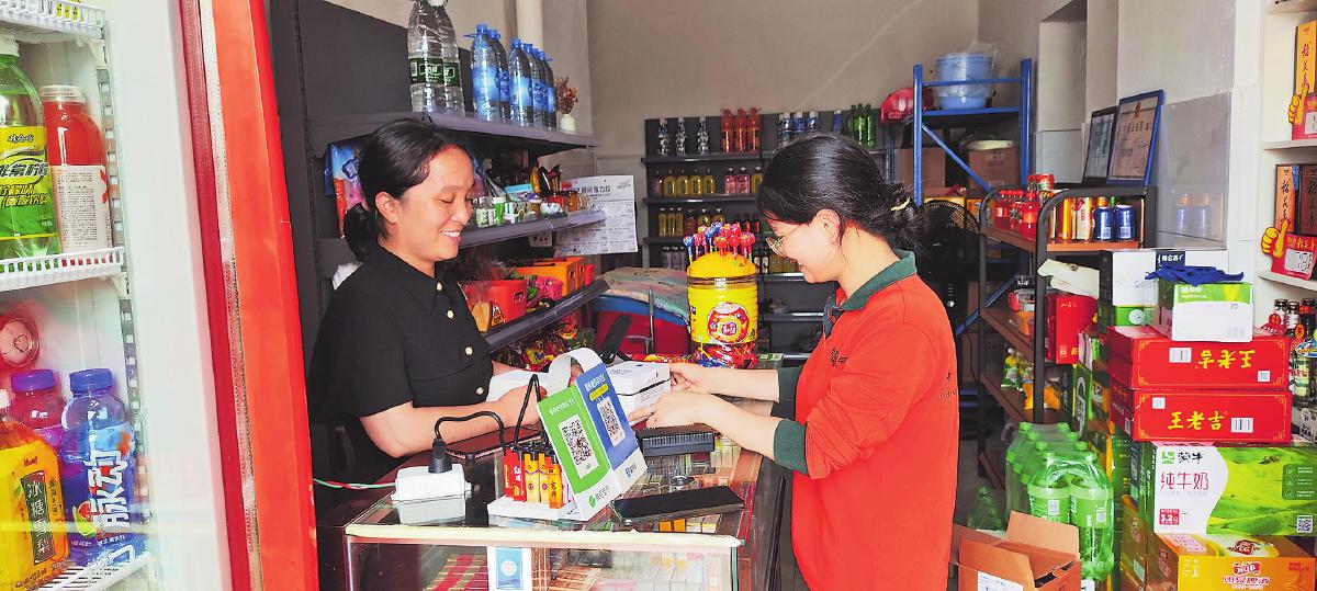 攬投員在居民小區(qū)便利店宣貫“寄件寶”掃碼操作流程。 □黃舒穎 攝