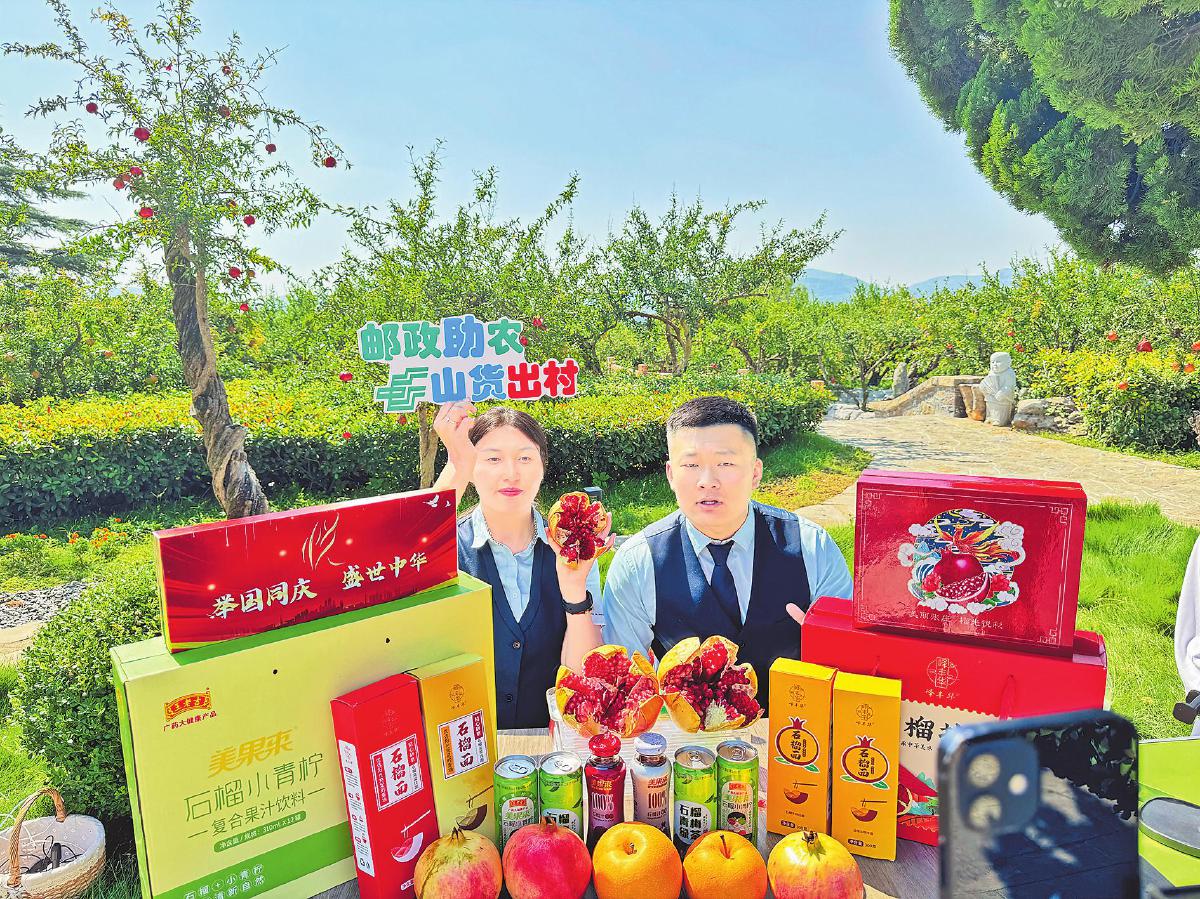 棗莊郵政在石榴園進行助農直播。□程菲 攝