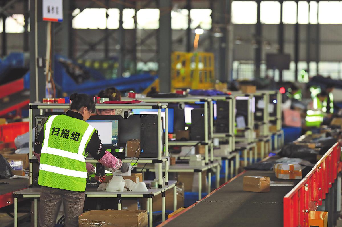 工作人員將入庫(kù)后的郵件逐件掃描換單,一件件貼上郵政面單的包裹將通過(guò)專車發(fā)往新疆。 □韓穎 攝