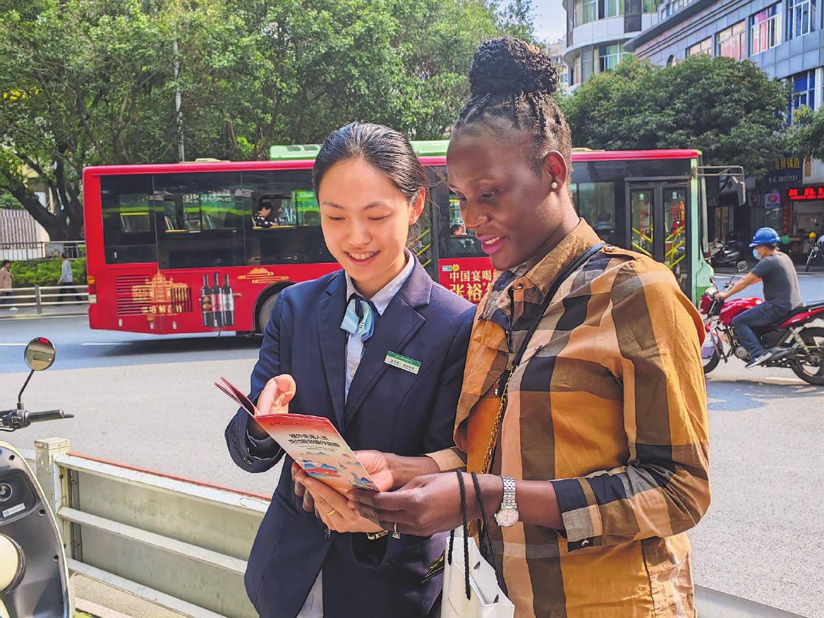 郵儲銀行福建省南平市分行工作人員在網點周邊向外籍客戶宣傳“零錢包”?!跣ぞS珍攝