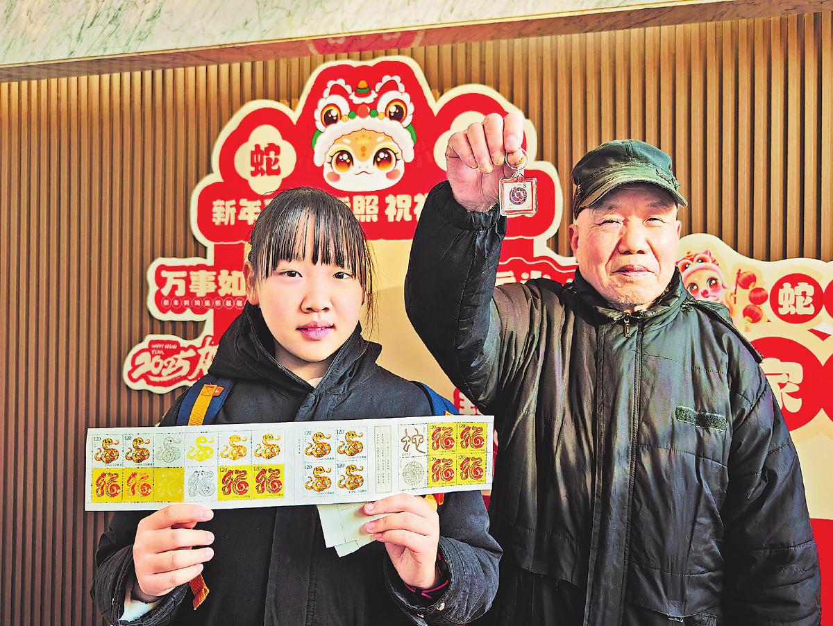 在江蘇省徐州市金山東路的郵票門市部,75歲的資深郵迷沈師傅帶著12歲的孫女最先買到了本命年生肖郵票,高興地向郵友展示其自制的第一輪蛇年生肖郵票鑰匙扣。 □謝安吉 攝