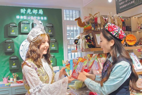 走進大巴扎主題郵局,琳瑯滿目的文創產品吸引了眾多游客駐足觀賞、購買。整面墻的新疆風光明信片和醒目的“時光郵局”4個字最先抓住游客的眼球。來自全國各地的年輕人將對未來的期待、對生活的感悟、對親人的思念,寫在信紙上裝入信封,投入“時光郵局”的信箱,寄給未來的自己,充滿儀式感。