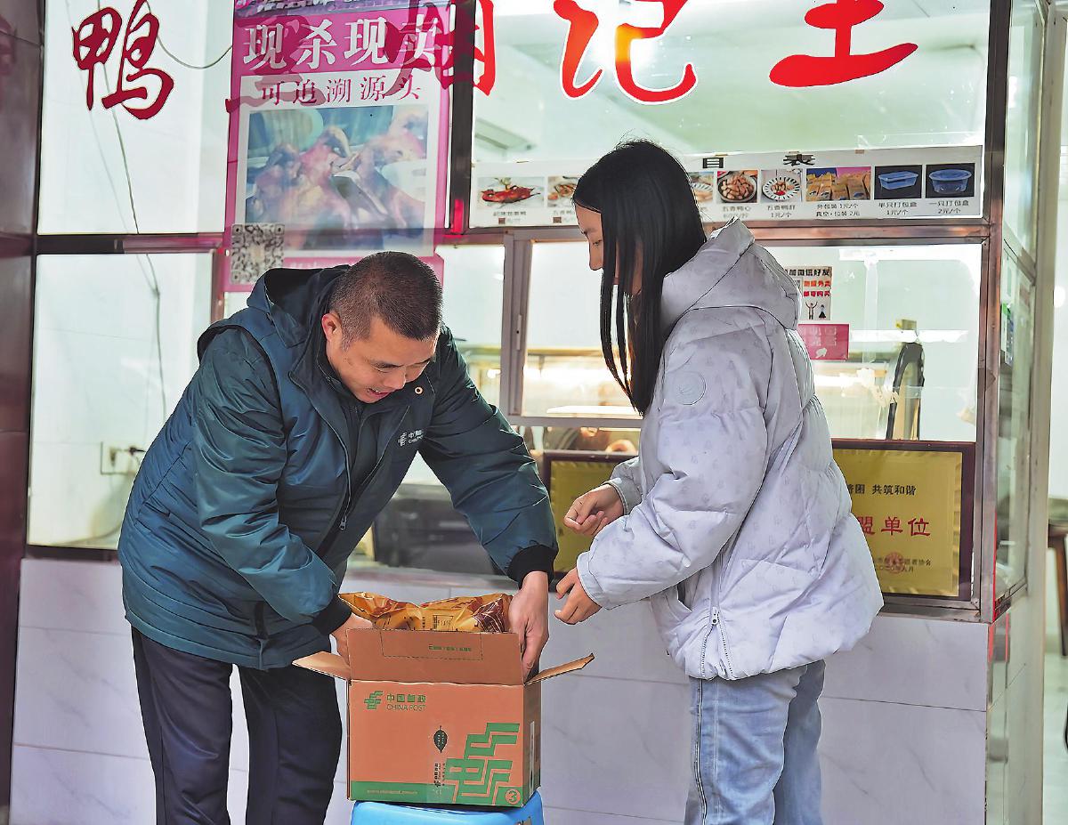 在熱門的樂山甜皮鴨店,郵政攬投員主動上門攬件,幫助游客實現“即買即寄”旅行零負擔。□何宇龍 攝