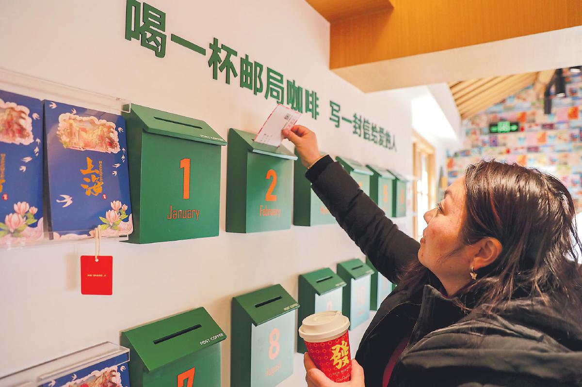 春節(jié)期間,位于上海七寶古鎮(zhèn)的七寶咖啡郵局引來眾多游客打卡。該郵局將咖啡文化、古鎮(zhèn)文化與郵政文化相結(jié)合,市民和游客在享用咖啡、感受古鎮(zhèn)魅力的同時(shí),還能制作個(gè)性化明信片,加蓋紀(jì)念章和郵政日戳,把美好的祝福郵寄給親朋好友。