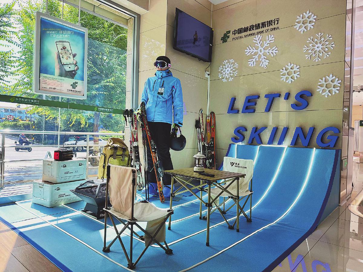 崇禮支行居于“雪國”一角,以其別具一格的創意與設計,于冬日里帶給客戶一抹溫暖。網點內夢幻般的雪花燈、憨態可掬的雪娃娃、英姿勃發的滑雪者造型以及多樣的戶外運動裝備,無一不述說著雪國戶外天堂的故事(見下圖)。
