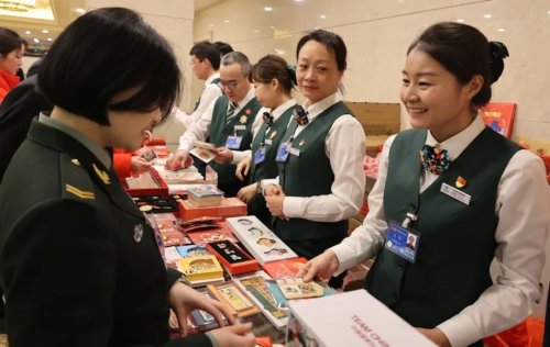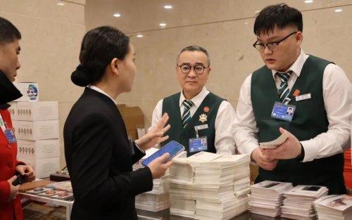 在駐地臨時郵局的柜臺前,代表委員和兩會工作人員或翻閱《郵政服務指南》了解郵票郵品設計內涵,或用手機拍攝文創冰箱貼為親友挑選禮物,更有集郵愛好者仔細對比郵品的工藝細節。“在兩會服務的前期,我做足了功課,學習了產品特點和服務要點。能參加這次全國兩會的服務感到非常榮幸,希望能圓滿地完成此次任務。”第一次參加全國兩會郵政服務的許勇介紹。