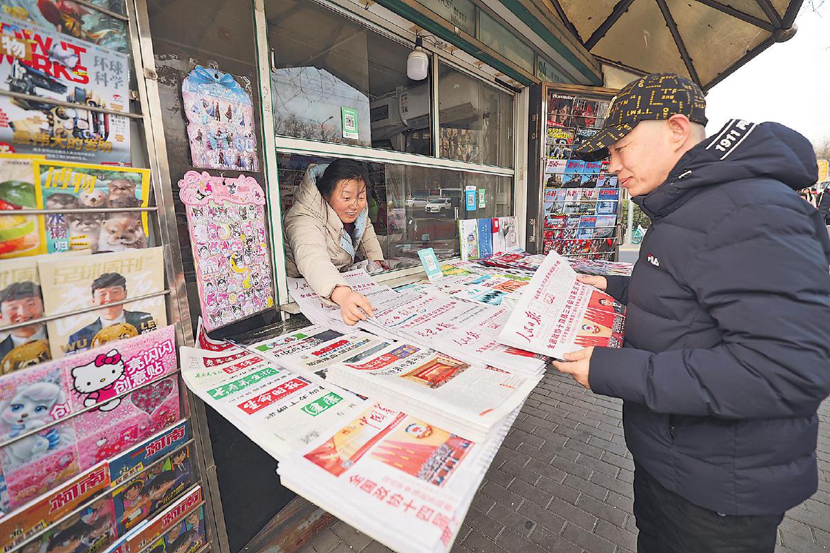 2025年全國兩會召開以來,各地郵政全力以赴做好黨報黨刊投遞工作,確保兩會精神及時傳遞到基層。北京市郵政分公司精心組織,報刊發行局成立服務專班,設立分發專區,嚴控各環節時限;員工提前到崗,每日加密投遞頻次;開辟“專人專車、隨到隨送”綠色通道,實現重點區域報刊亭“當日見報率”達100%。圖為北京西城區廣安門外大街報刊亭“兩會專架”前,市民一大早就來駐足翻閱、購買最新的刊載有兩會報道的《人民日報》等報紙。