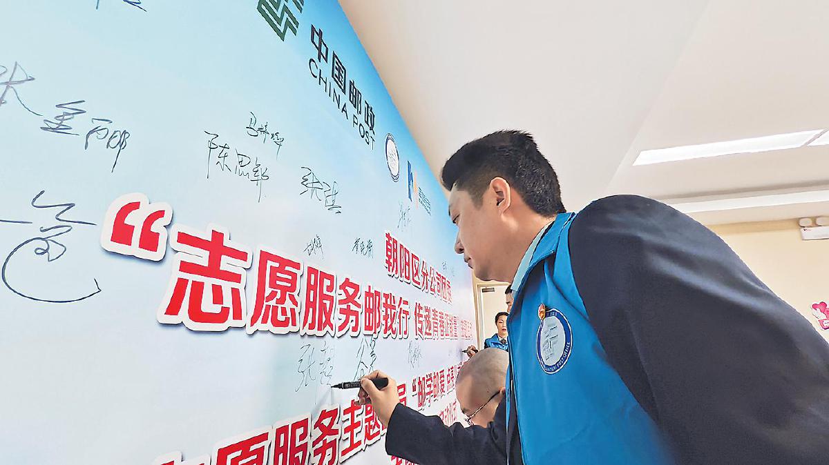 北京郵政青年志愿者在主題墻上簽下自己的名字,立志為志愿服務貢獻更多力量。