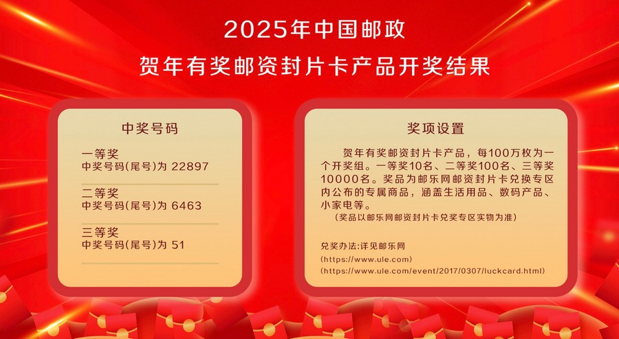 3月24日,2025年中國郵政賀年有獎郵資封片卡產品開獎結果產生。賀年有獎郵資封片卡產品每100萬枚為一個開獎組,每個開獎組設3個獎項。獎品為郵樂網郵資封片卡兌換專區內公布的專屬商品,涵蓋生活用品、數碼產品、小家電等,以郵樂網郵資封片卡兌獎專區實物為準。