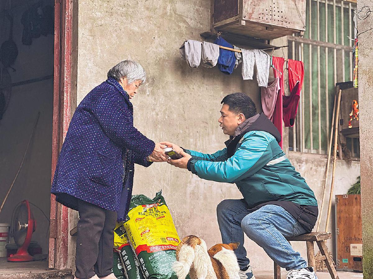 廣安市郵政分公司投遞員一大早將化肥送到農戶家中,農戶端出一杯水表示感謝。 □劉雙華 攝
