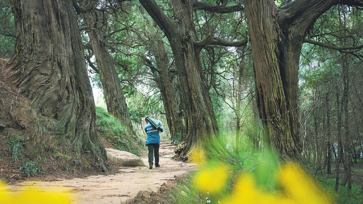 劍閣縣郵政分公司投遞員為龍源鎮的農戶送肥料,途中經過蜀道古柏群。□張平 攝