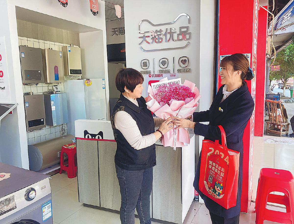 唐學梅(右)在節日里給大客戶送鮮花。