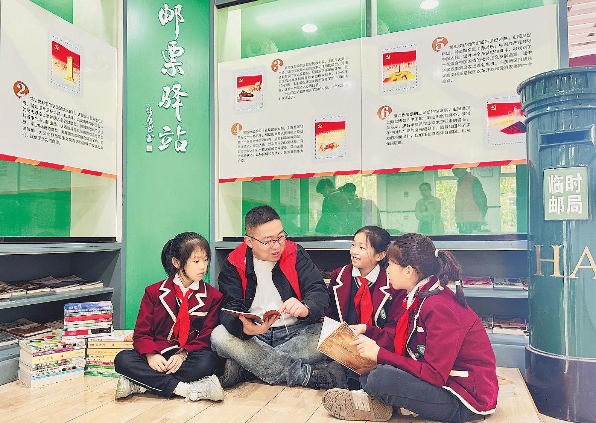 4月22日,江蘇省海安市郵政分公司走進城南實驗小學“郵票驛站”,開展全民閱讀圖書校園巡展活動。活動現場,同學們與郵政志愿者共讀集郵圖書,學習郵票知識。 □韋雅琴 攝影報道