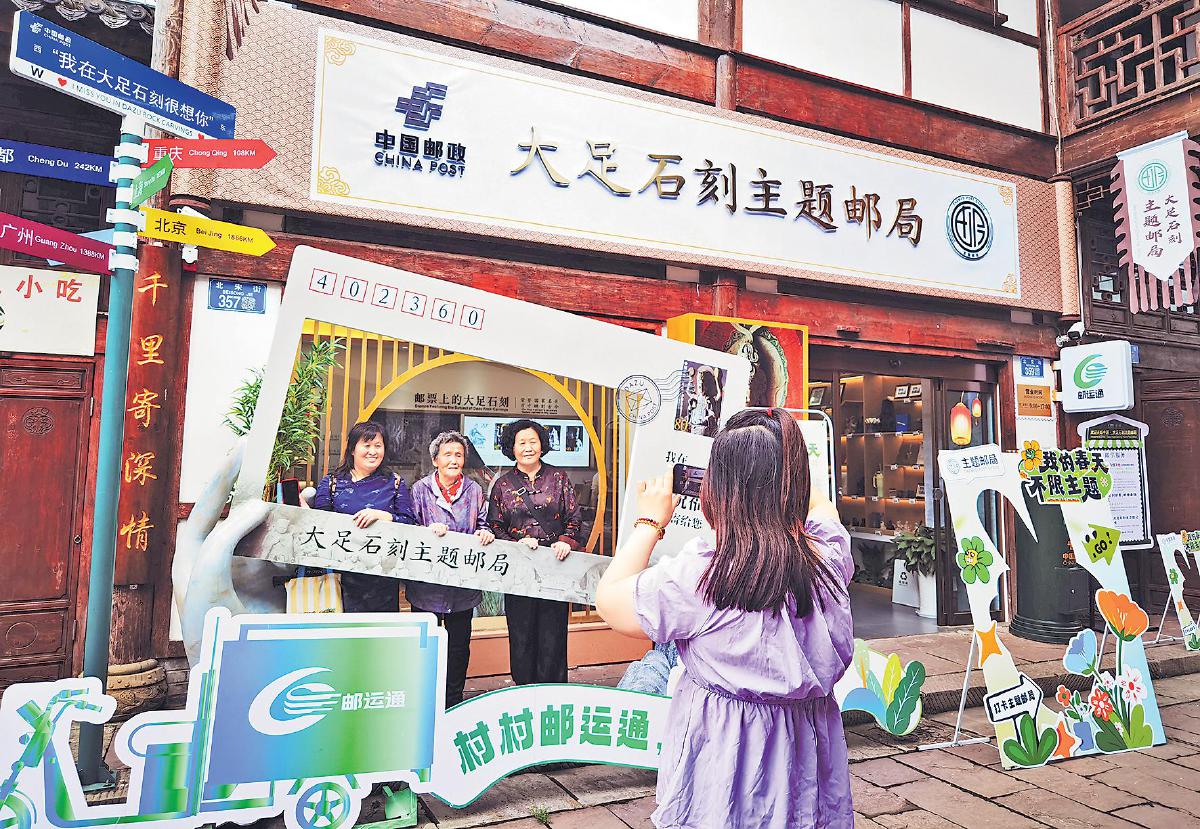 在最火的紀念服務區,手持明信片、手賬本等候蓋章的游客排起長龍。大足郵政特別設計的“觀音”“臥佛”“吹笛女”“六道輪回”4個套色章和6個主題單色章,深受游客喜愛。主題郵局工作人員梁葦笑言:“因為太受歡迎,印章都蓋壞又補刻幾個了。”“到一個地方旅游,就是要留下當地最有特色的文化符號。”來自上海的程女士一家正是被這份文化魅力吸引而至。