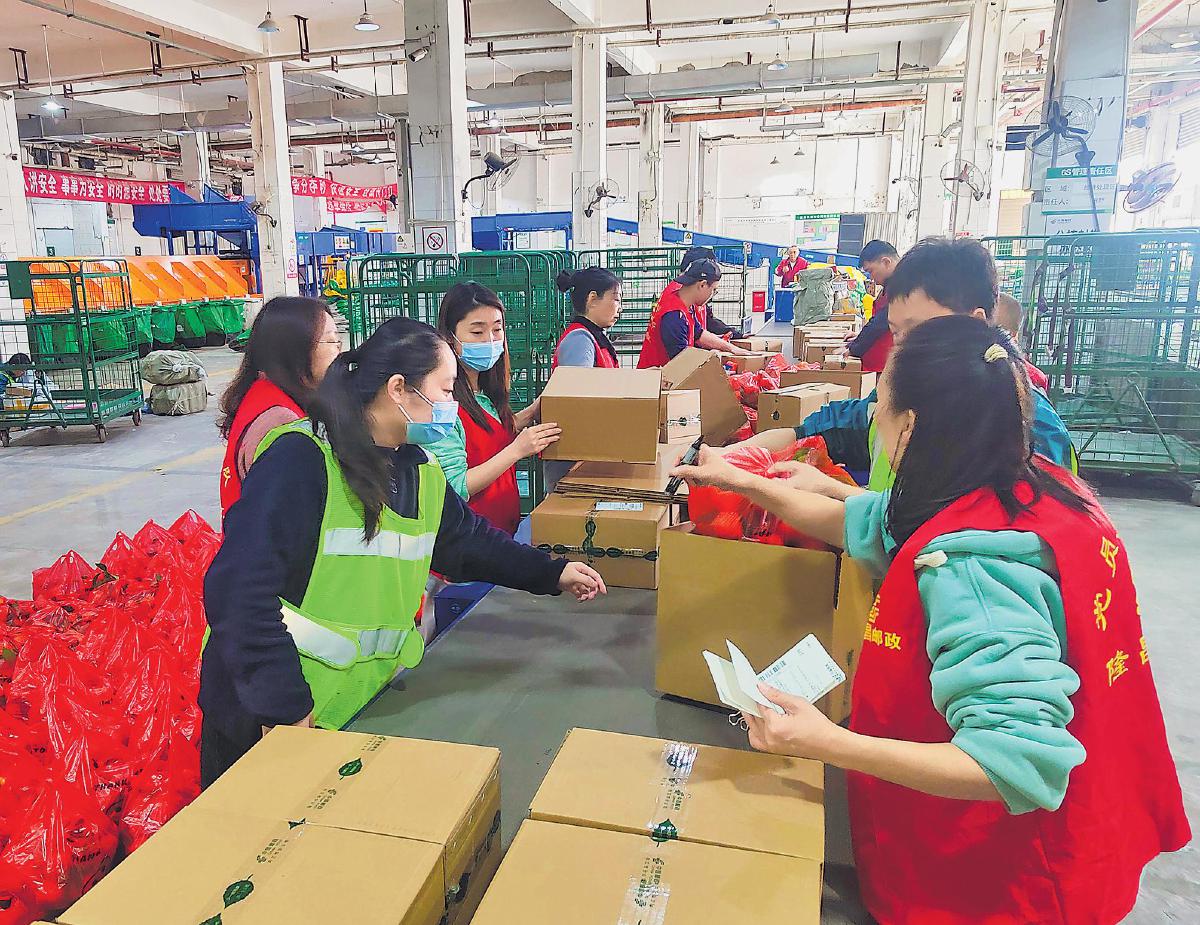 工作人員在隆昌郵政郵件處理中心包裝發運沃柑。 □袁潞 攝