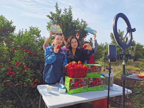 銅梁郵政主播與村干部聯(lián)手在柑橘園內(nèi)開展助農(nóng)直播。 □楊洋 攝